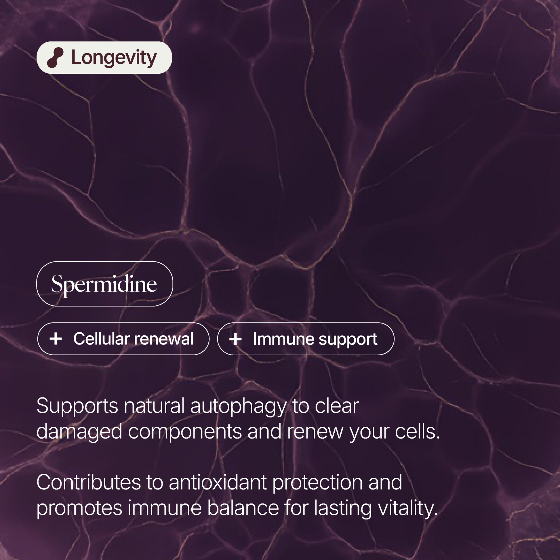 Spermidine promotes autophagy, the body’s natural cellular renewal process - helping maintain youthfulness and support longevity.