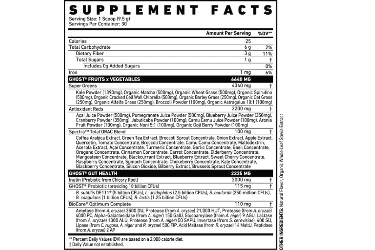 - Ghost Fruits & Vegetables (Consisting of super greens, antioxidant blend, SPECTRA ™ total ORAC blend)