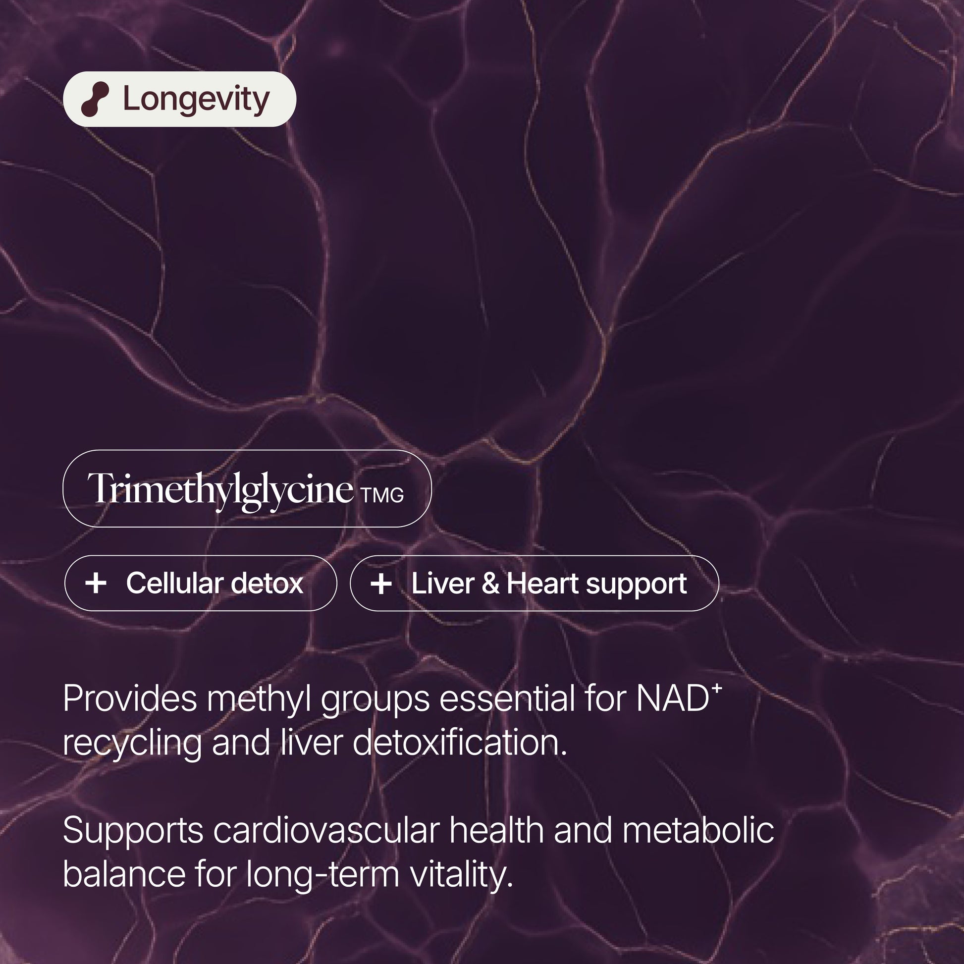 TMG (Trimethylglycine) fuels methylation - an essential process for DNA repair, liver function, and cardiovascular health - helping sustain long-term vitality.
