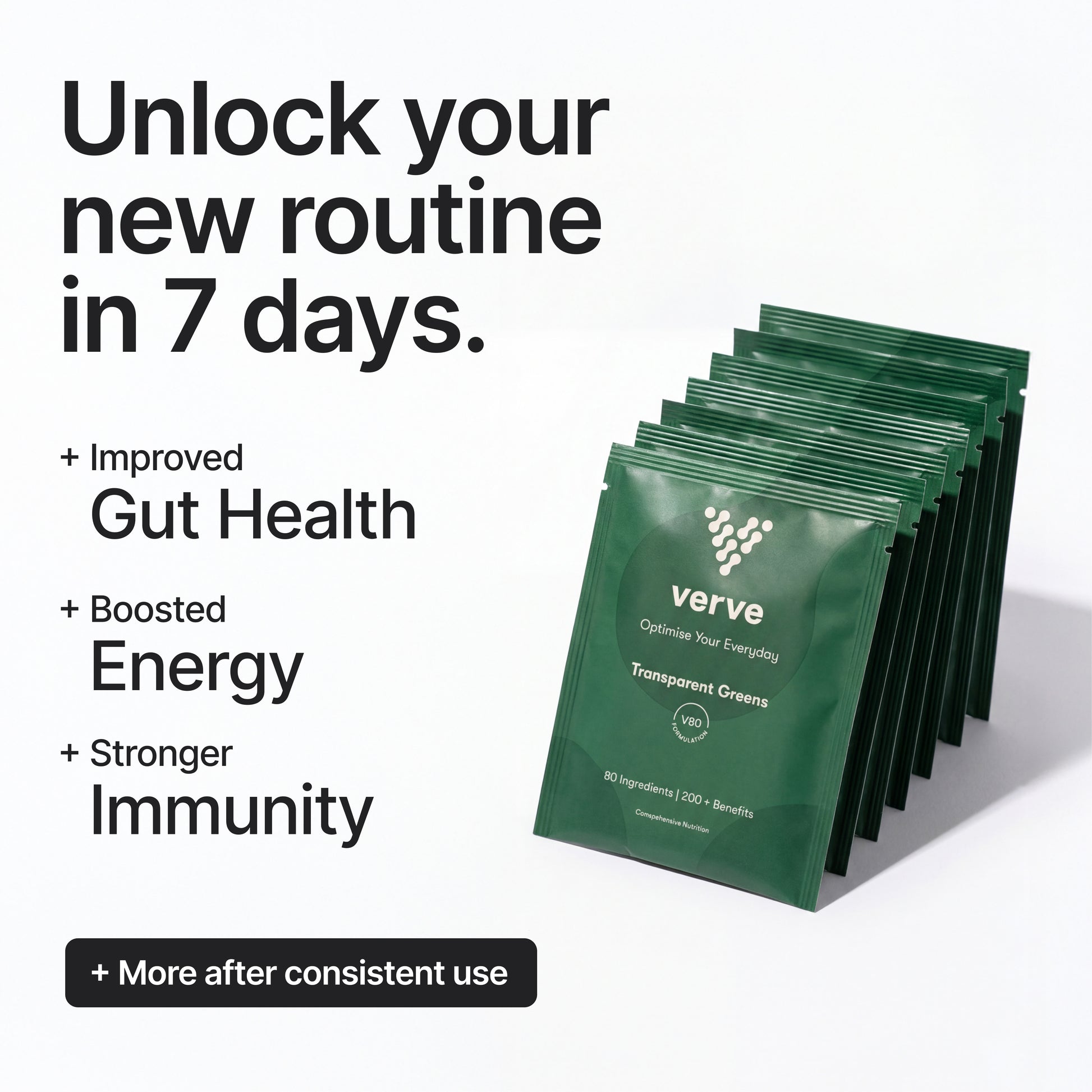 Experience the power of 80 clinically selected ingredients with Verve’s V80 Transparent Greens in a convenient 7-sachet Travel Pack. Designed to support daily energy, immunity and gut health, this format makes it easy to stay consistent wherever you are. Ideal for travel, trying Verve for the first time, or kickstarting your daily greens routine.