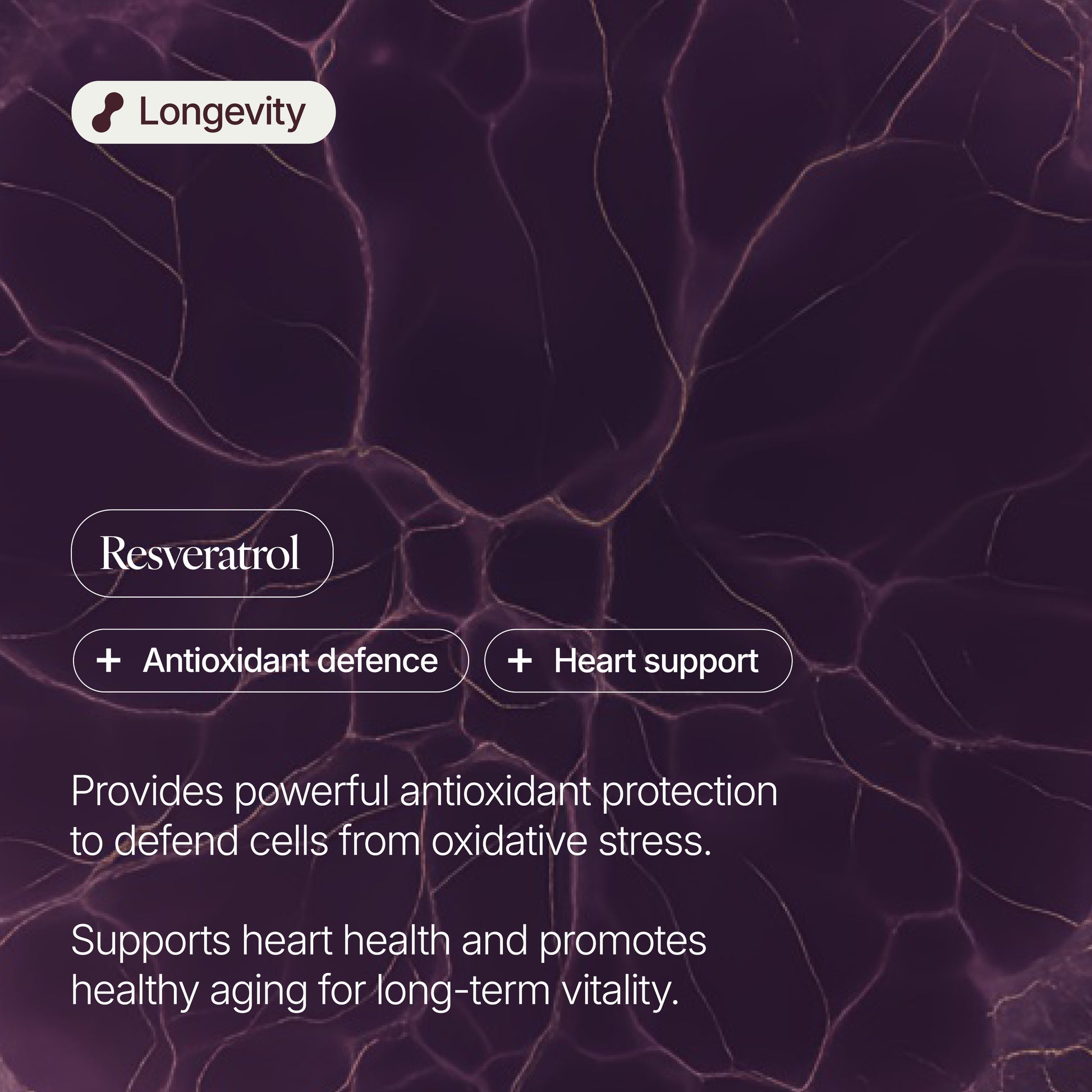 Resveratrol Balance is formulated to activate key longevity pathways and support healthy ageing. It enhances energy metabolism and protects against oxidative stress, supporting heart, brain, and cellular vitality.